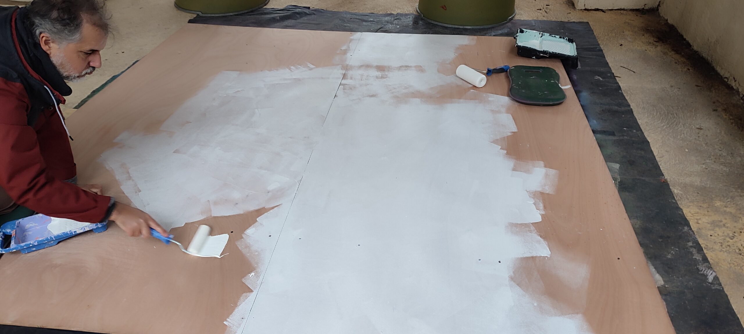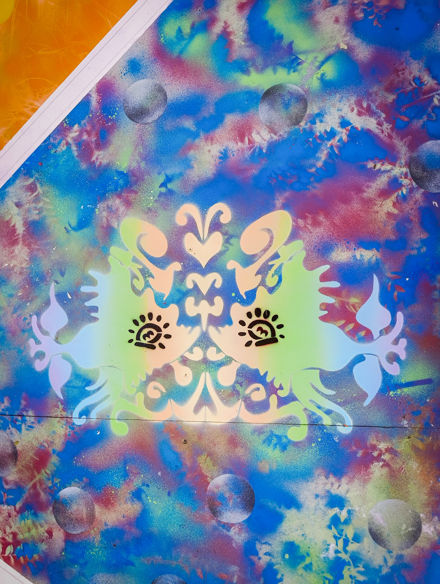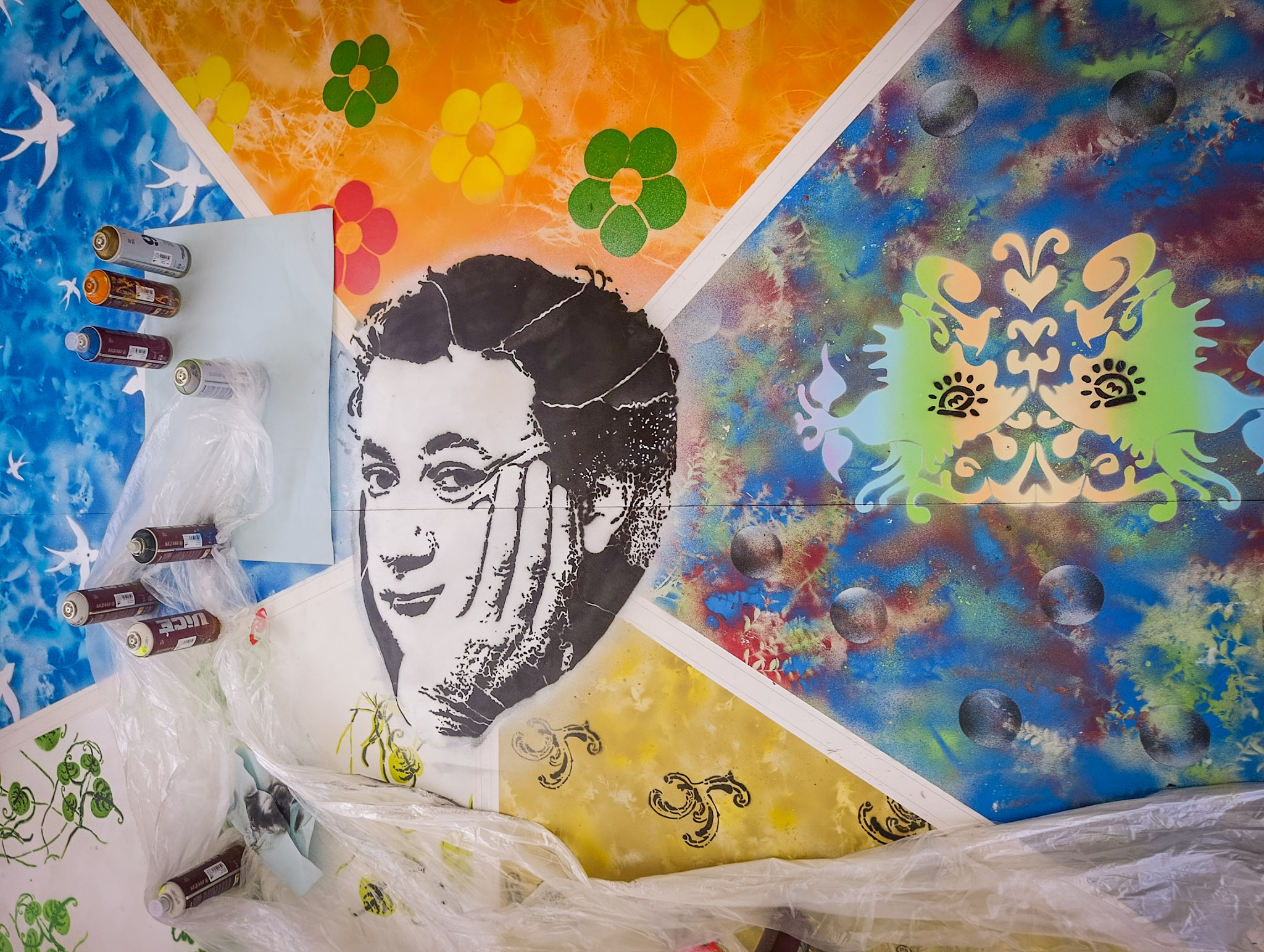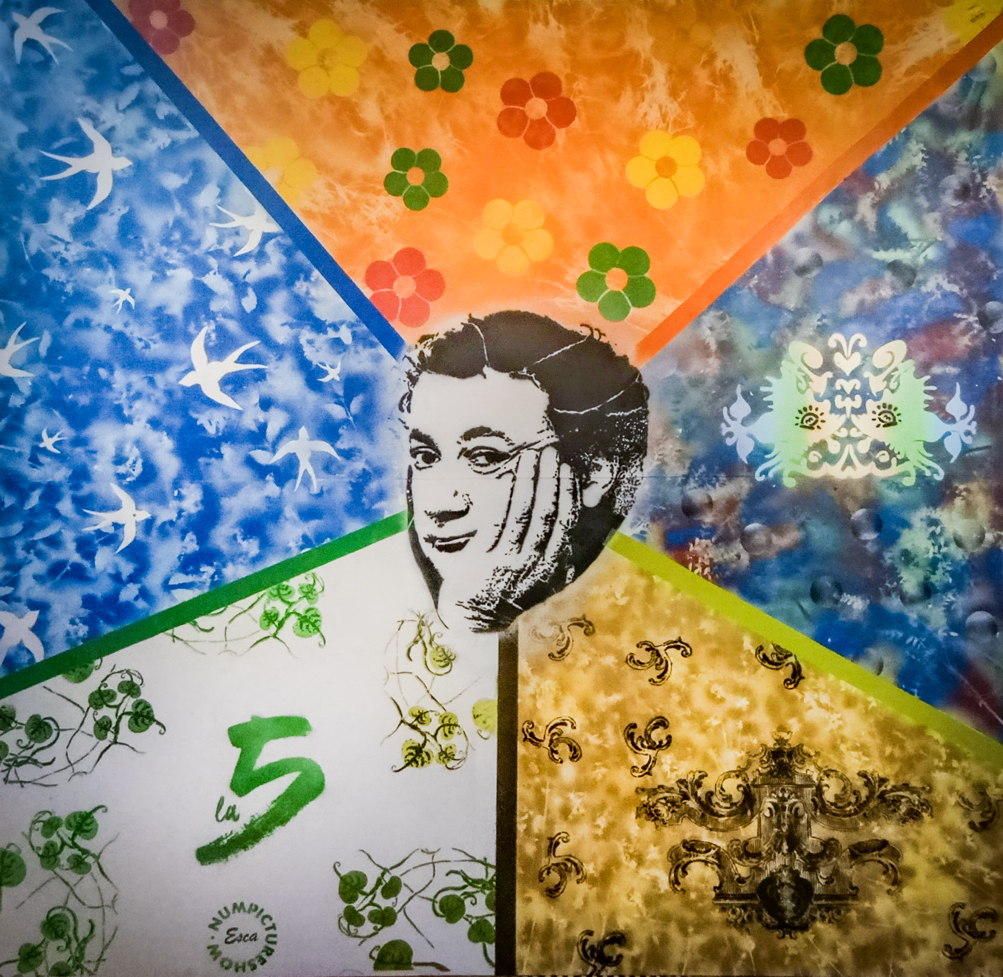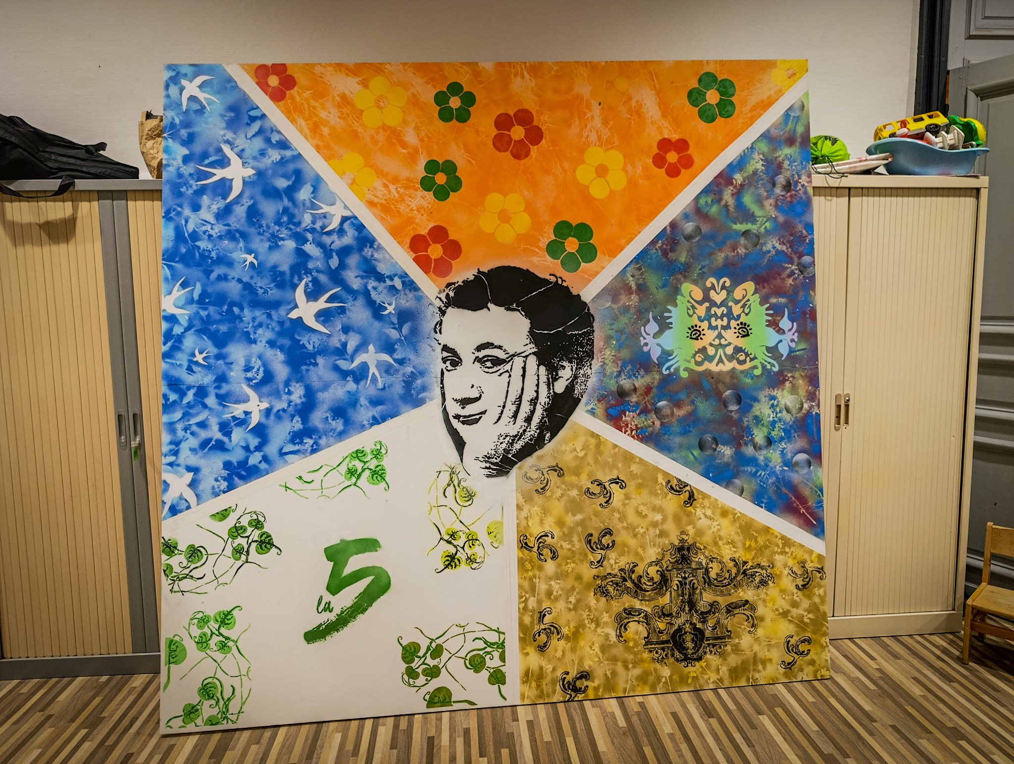 Au centre, nous avons placé un élément emblématique du lieu : la photo de Coluche présente dans la Maison pour Tous. Esca l’a reprise au cutter, en découpant le pochoir pour l’intégrer au cœur de la composition, comme un point d’ancrage entre l’histoire du lieu, le quartier et la création du jour.