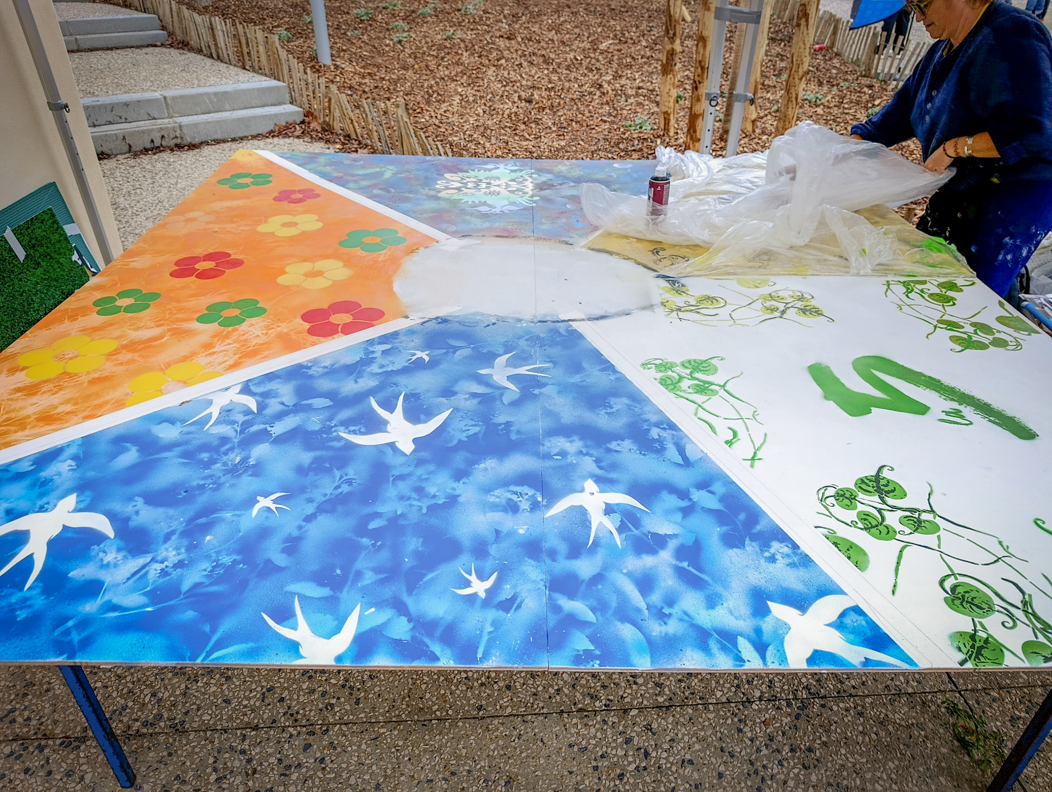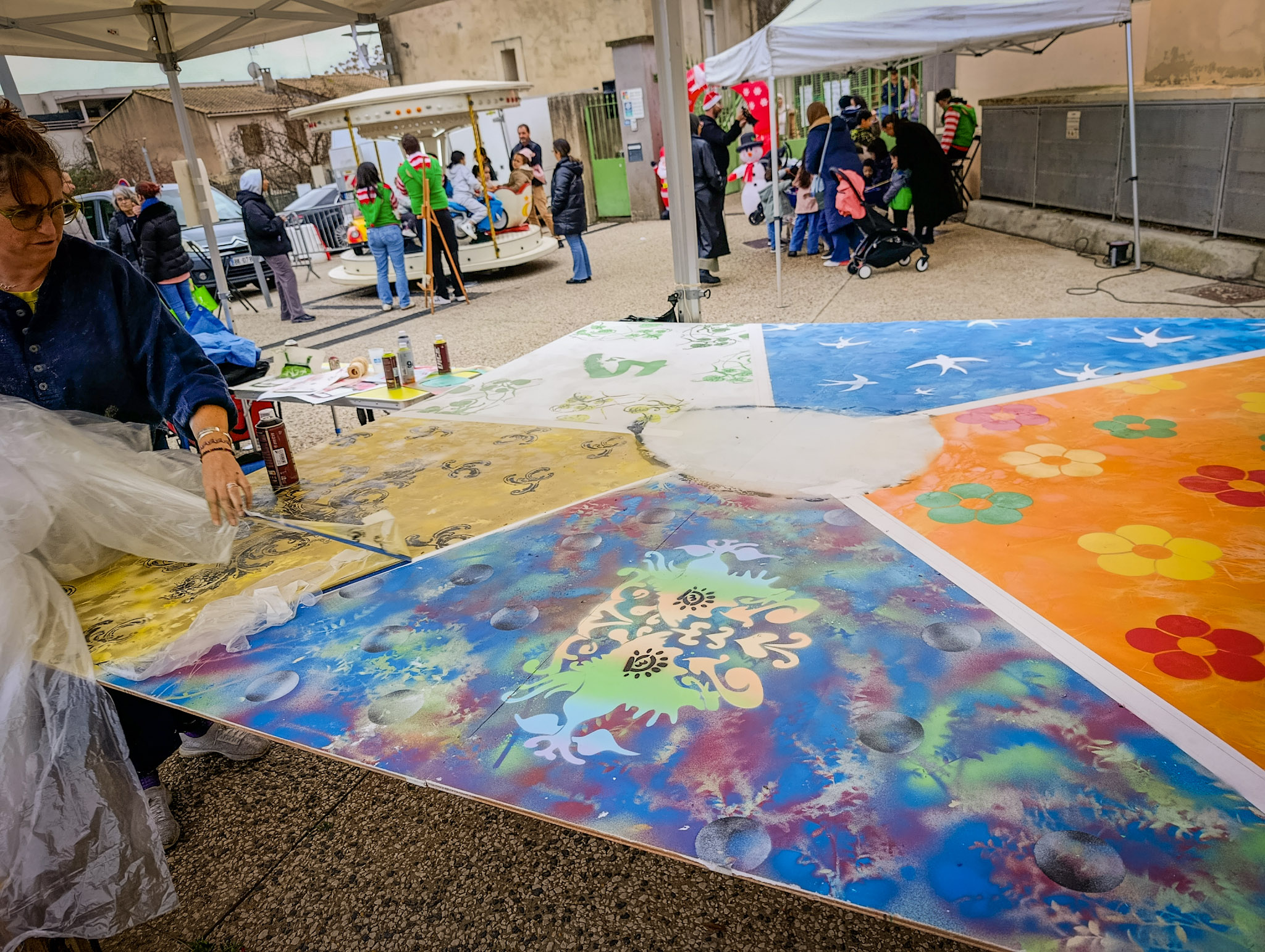 Le 20 décembre, à l’occasion des 25 ans de la Maison pour Tous Colucci et de l’inauguration de la ligne 5 du tramway de Montpellier, nous avons été invités à réaliser une fresque participative au cœur de cet événement festif.