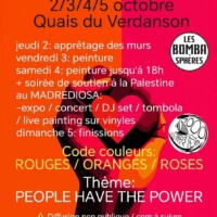 En octobre, une JAM pochoir s’est tenue dans le lit du Verdanson, sous l’impulsion d’Adey, pochoiriste, avec l’aval et le soutien des Bombasphères. Pensée comme un temps de création libre et collective, cette JAM a réuni plusieurs artistes aux univers singuliers autour d’un thème chromatique commun.