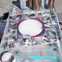Les fonds végétaux, les sphères légères et les dégradés colorés caractéristiques de leur univers se sont déployés sur les supports donnés pour l’exposition collective Stencil 2025, transformant cette journée en un moment de création collective et de lien humain.