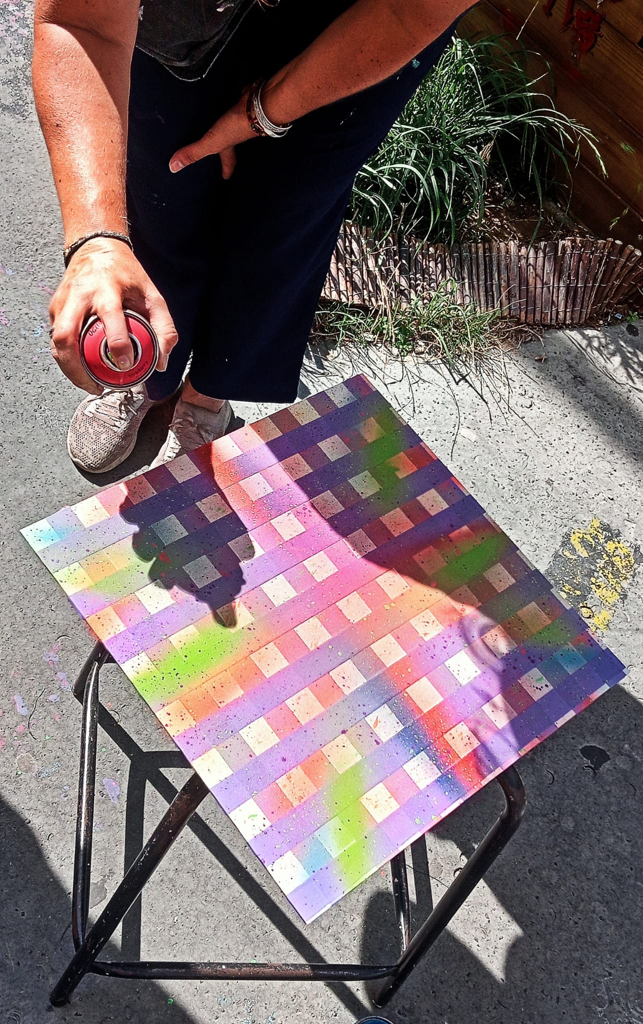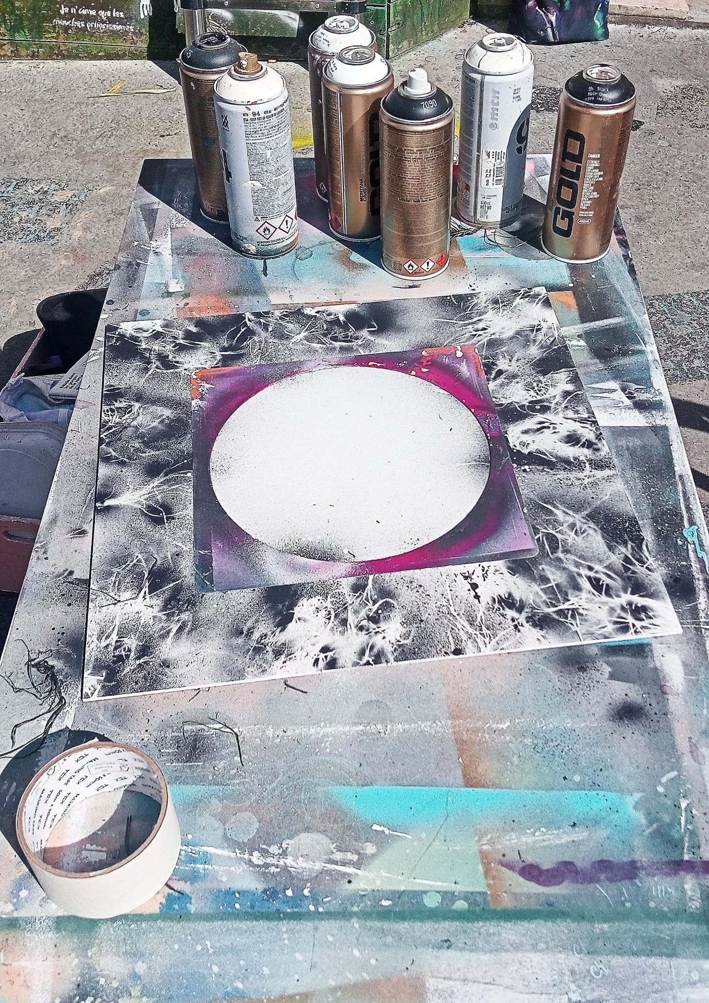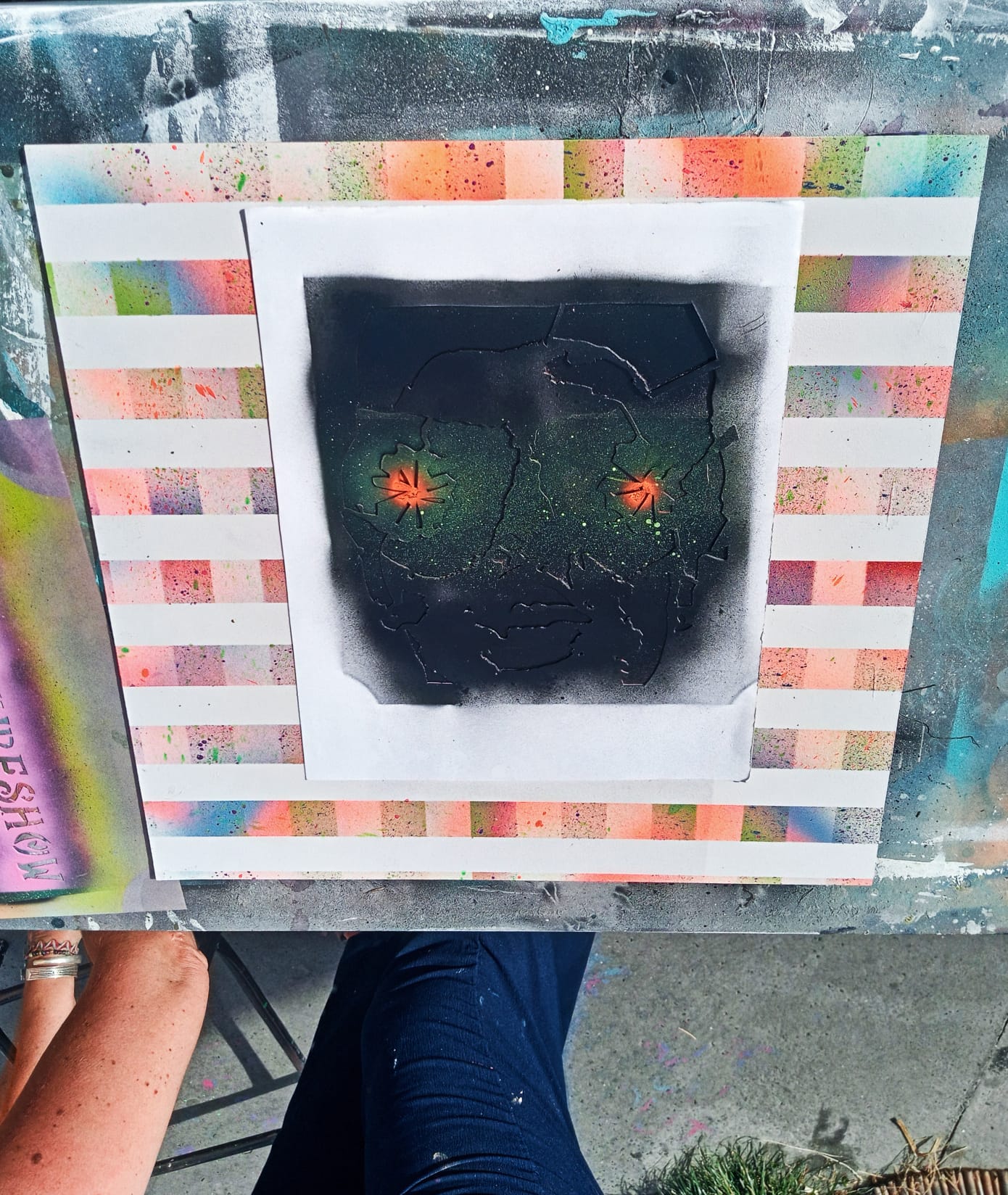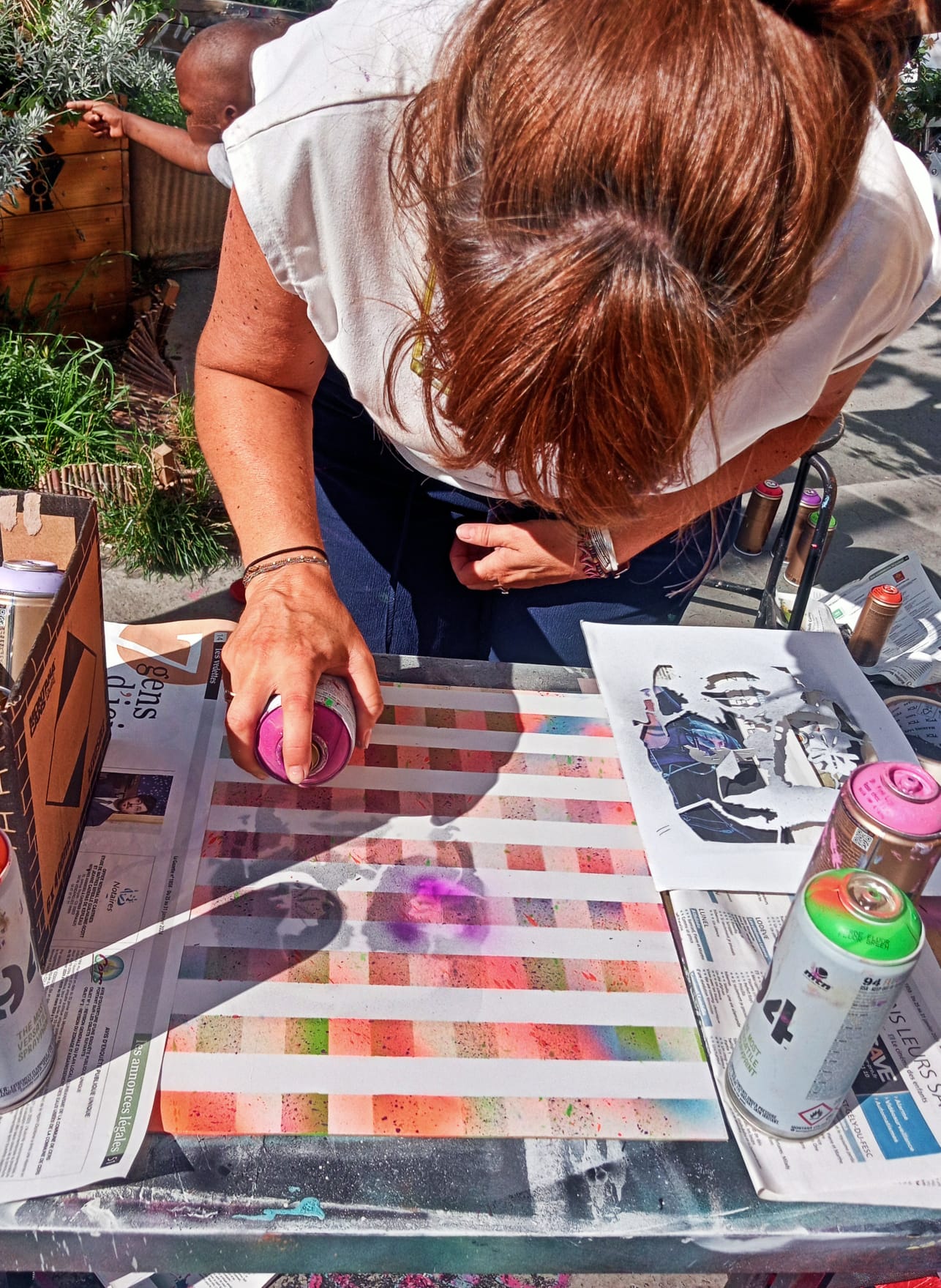 Les fonds végétaux, les sphères légères et les dégradés colorés caractéristiques de leur univers se sont déployés sur les supports donnés pour l’exposition collective Stencil 2025, transformant cette journée en un moment de création collective et de lien humain.