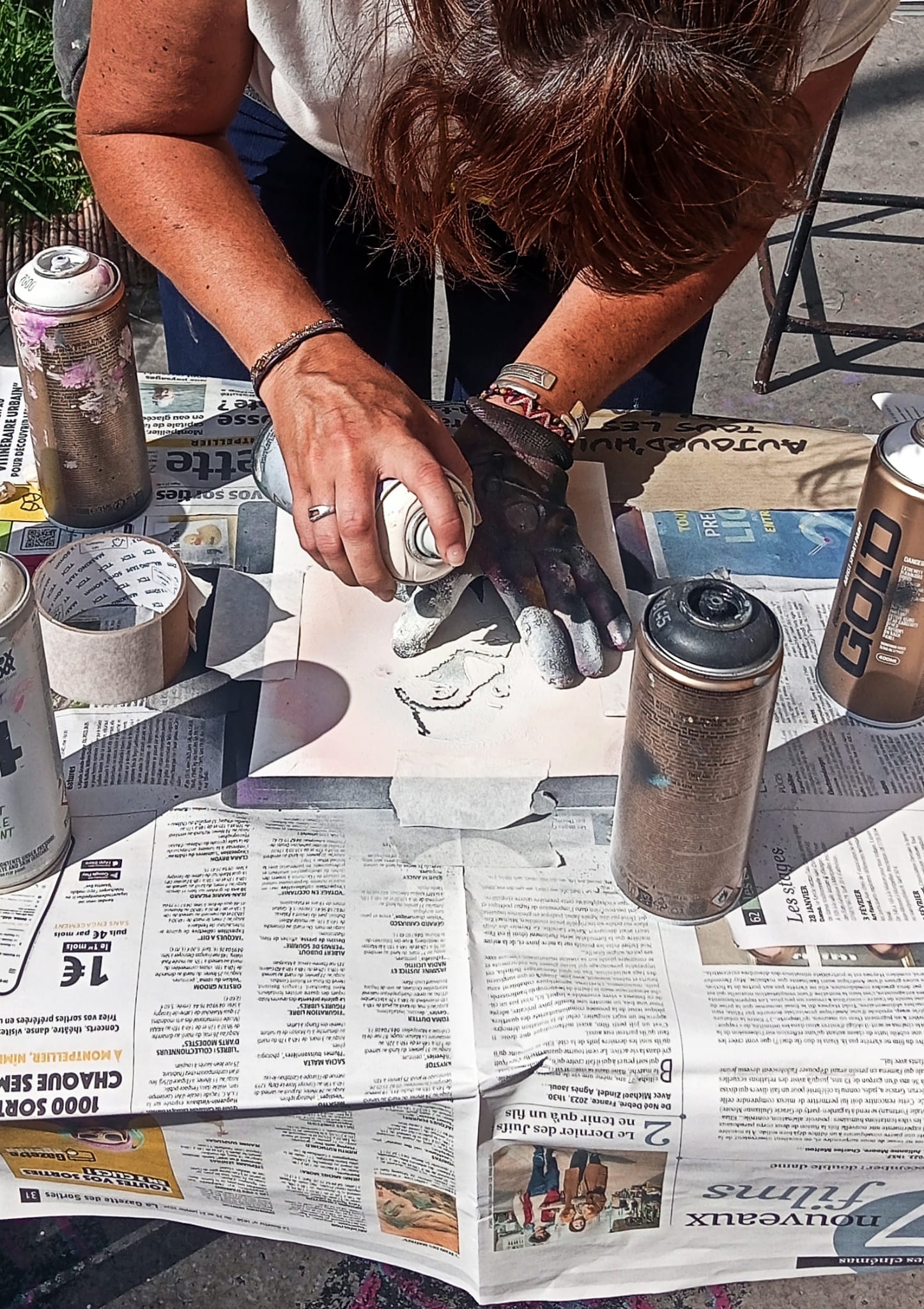 Dans ce lieu vibrant du 18ᵉ arrondissement, Esca et NumPictureShow ont partagé leur démarche avec les passants, entre gestes précis de pochoir, échanges spontanés et sourires complices.