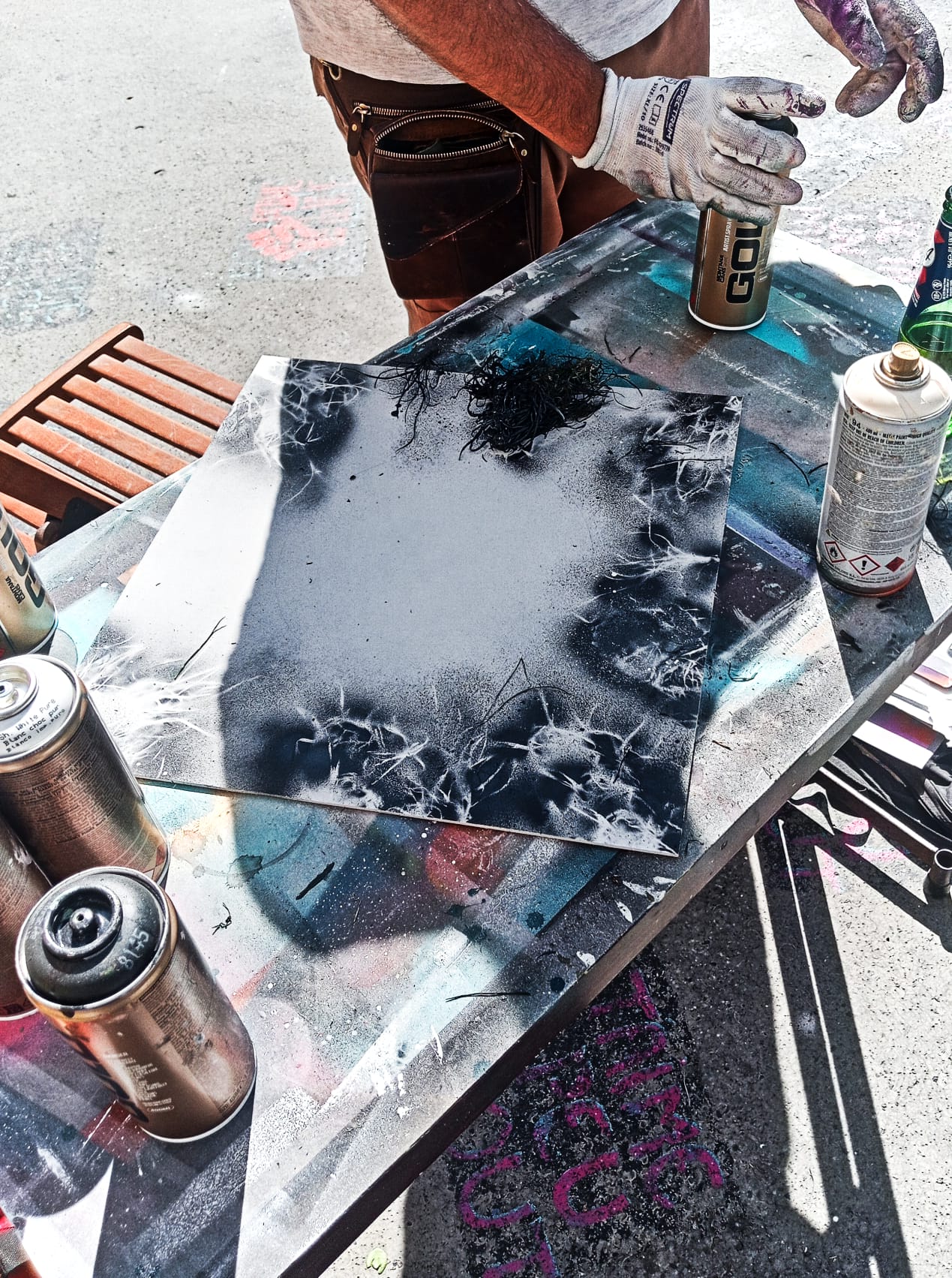 Accueillis chaleureusement par Joko et l’équipe du Spot, le duo s’est encore challengé en réalisant le pochoir à bout de bras sur une plateforme bringuebalante.