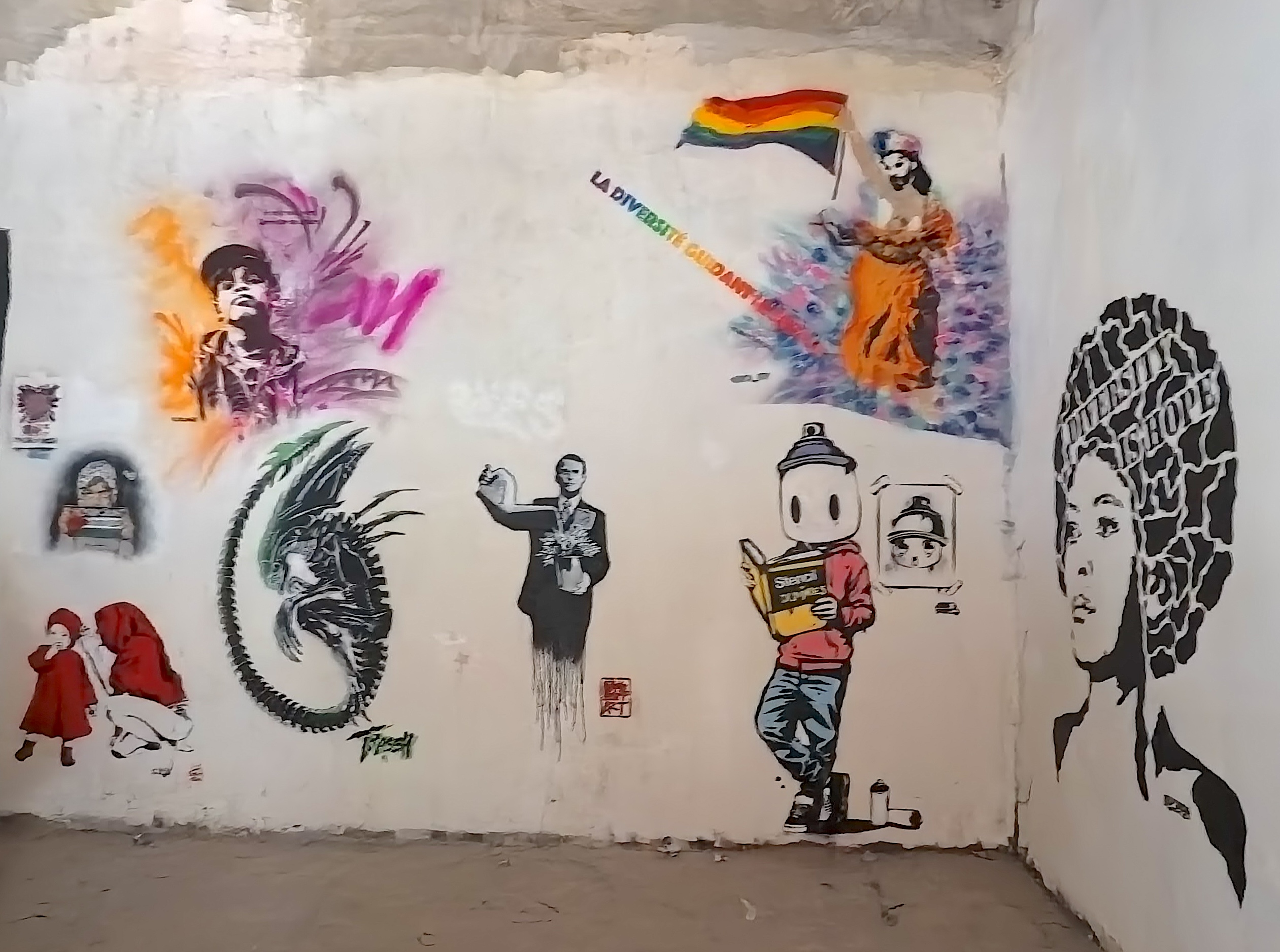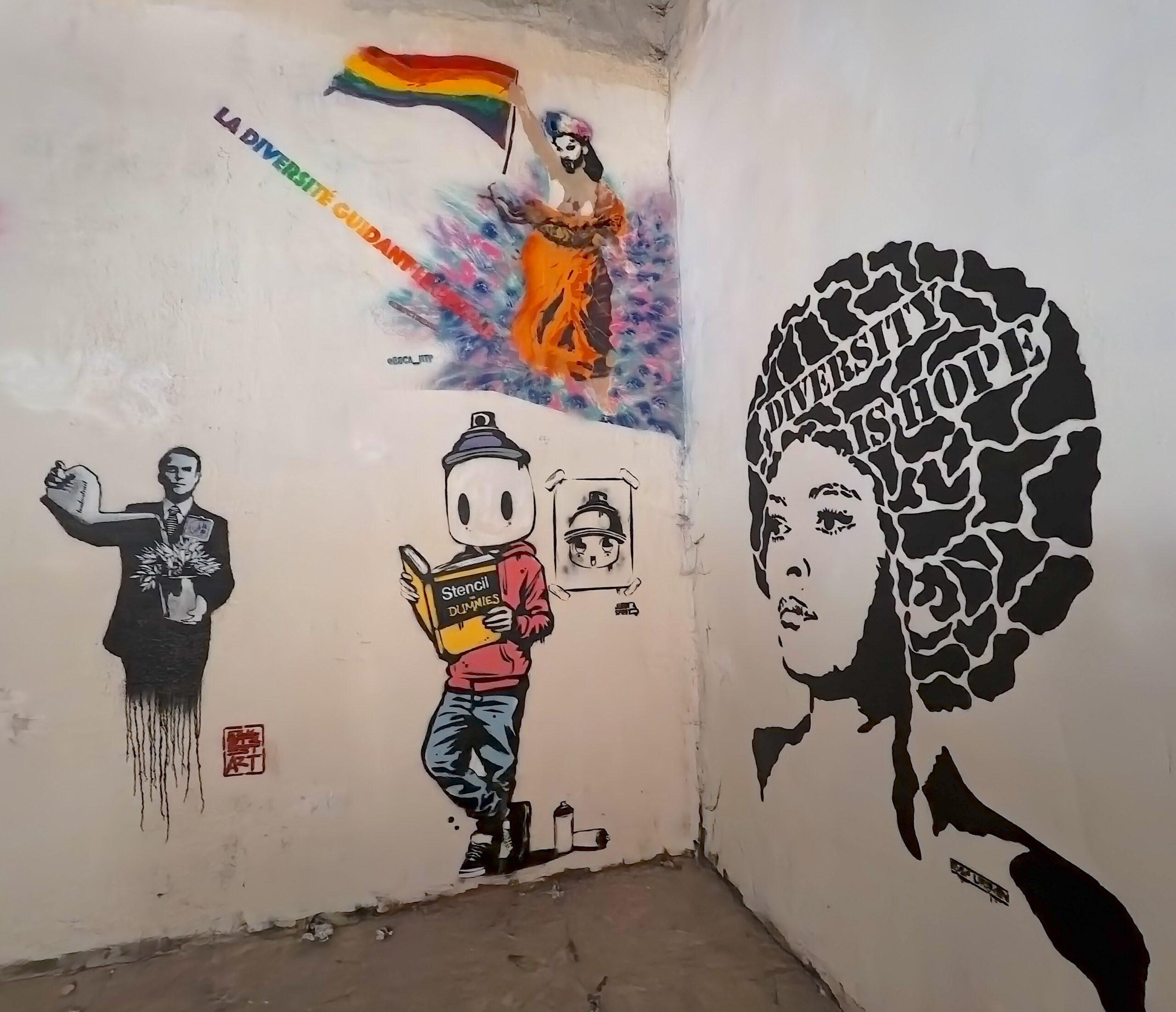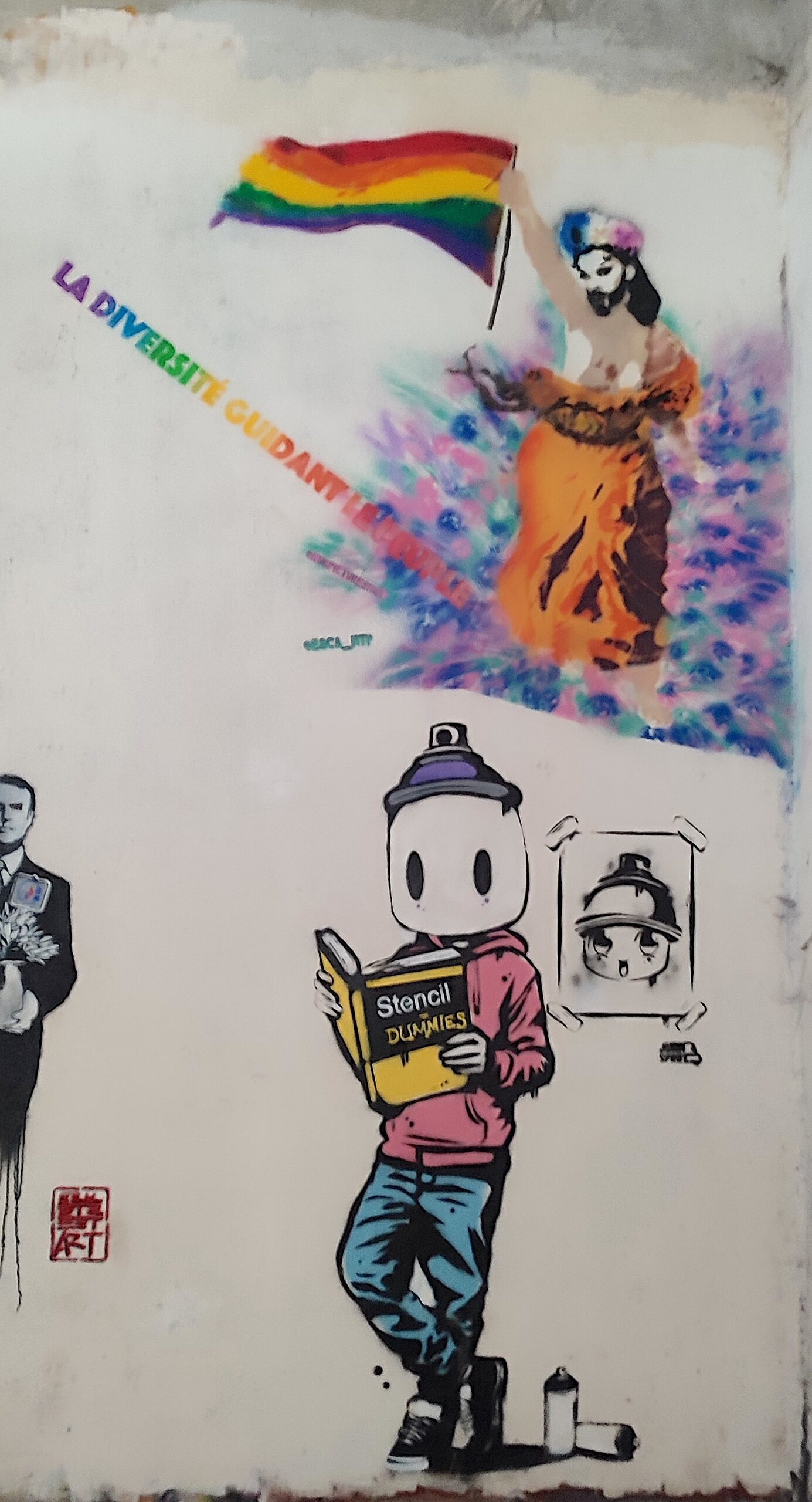 Dans la salle des pochoirs du Spot 13, haut lieu du street art parisien, Esca et NumPictureShow ont installé une nouvelle version de leur fresque emblématique : La Diversité guidant le peuple.