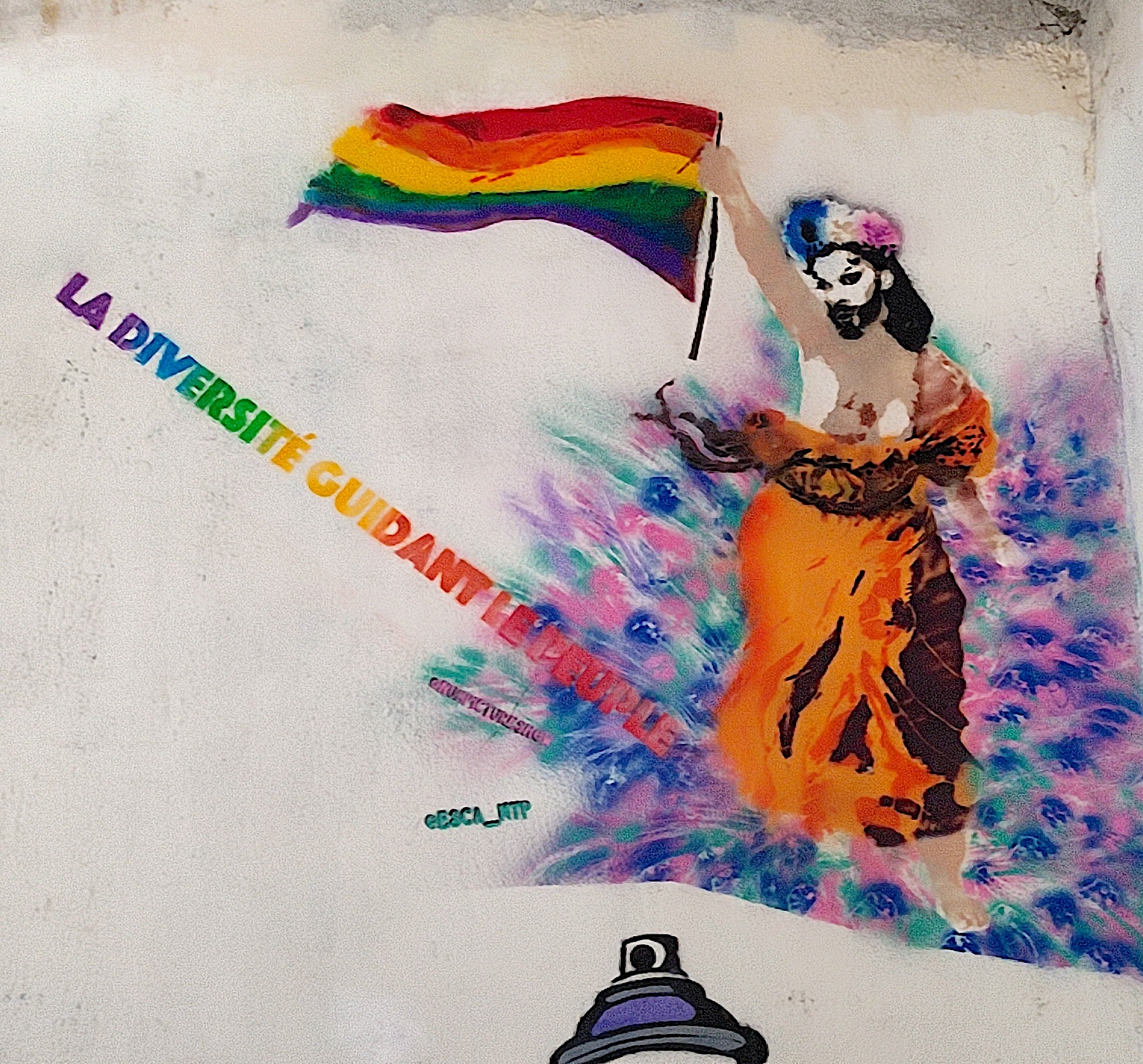 Sous le drapeau arc-en-ciel, la figure féminine, mi allégorie, mi héroïne contemporaine, incarne la liberté, la lutte et la fierté de toutes les identités.